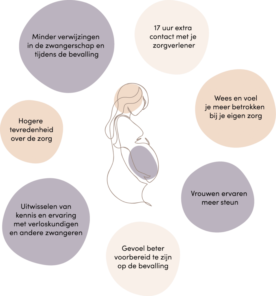 Bij Centering Pregnancy worden de medische controles en alle informatie rondom zwangerschap, de bevalling en de eerste babytijd gecombineerd. De bijeenkomsten duren 2 uur en vinden plaats samen met andere zwangeren die ongeveer rond dezelfde datum zijn uitgerekend. Op deze manier krijg je de gelegenheid meer onderwerpen te bespreken en dieper in te gaan op onderwerpen dan bij reguliere controles. Daarnaast is er mogelijkheid tot individueel contact met je verloskundige.